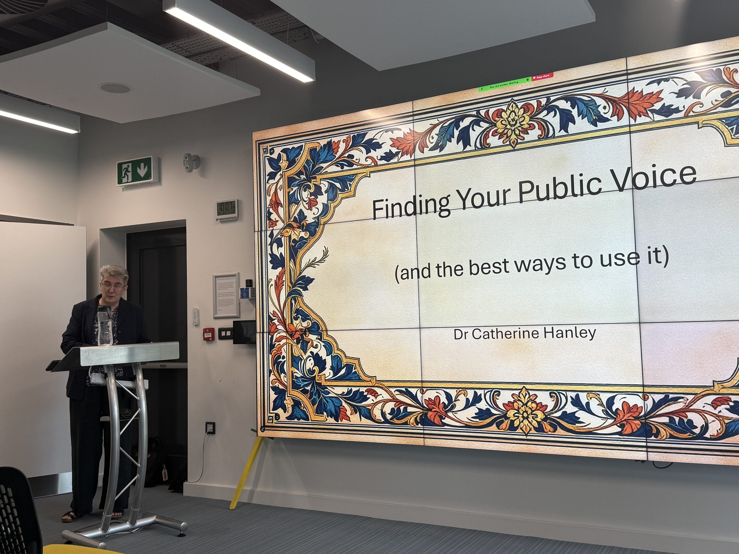 Day 1 of the conference was opened by this year’s keynote and Q&A session with Dr. Catherine Hanley, a Historian and author to an impressive collection of non-fiction trade books. Her talk ‘Finding your public voice’ discussed public engagement and offered insight into how to reach wider audiences with our research. The conference talks kicked off with Session 1 – ‘Identity’, where we travelled from the medieval Islamic Horn of Africa to seventh century Anglo-Saxon barrows and burial practices with Mario Llorente García, Wyatt Wilcox, and Hayley Haynes. Session 2 – ‘Elites and Non-Elites’, took us on a journey from examining the construction and function of Early Medieval Irish Crannógs, to exploring cultural identity during the English Norman Conquest through dietary practices and the sport of falconry with talks by Étienne Arsenault, Siddhant Sarkar and Hannah Britton. Session 3 – ‘Retaining and Sharing Heritage’ saw Silas Ploner, Simran Kaur, and Haidy Abdullah taking us on a journey exploring craft technique from cathedral building in Northern Europe, to funerary architecture during the Mughal period in India, to the re-analysis of the major historical site of Tell Abu Mandour, exploring themes of experimental approaches, site protection and shared heritage.